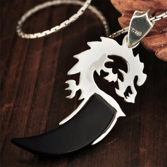 Dragon and Tooth-Shaped Natural Black Onyx Stone 925 Sterling Silver Vintage Pendant