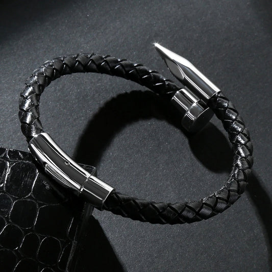 Stainless Steel & Leather Nail High Polish Bangle Bracelet