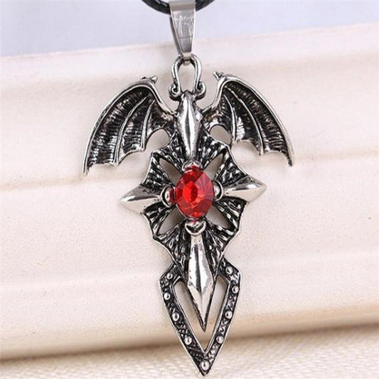 Silver Demonic Winged Sword Cross with Crystal Pendant Necklace