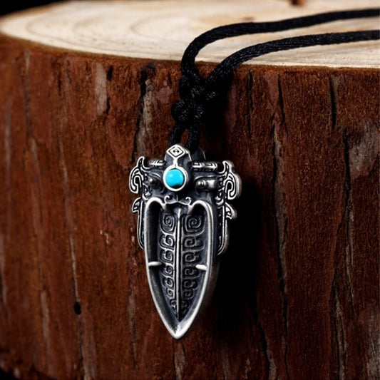 Chinese Mythical Animal Taotie with Artificial Turquoise Stone Inlay 925 Sterling Silver Biker Pendant Necklace