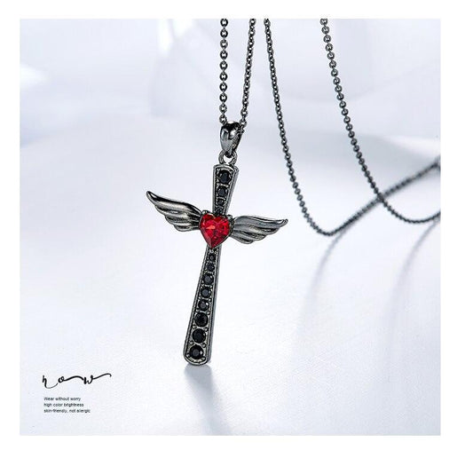 Black Wings Ruby Heart Cross Pendant and Chain Necklace