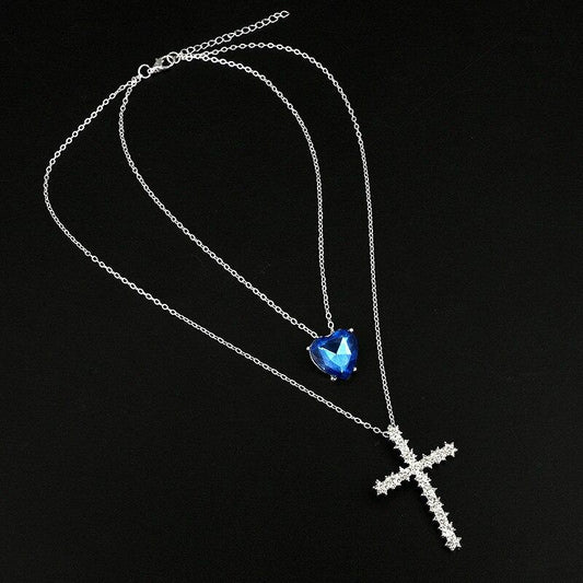 Silver Blue Heart Crystal Cross Pendant with Chain Necklace