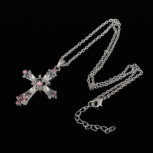 Silver Cross Pendant Necklace with Pink and Purple Crystals