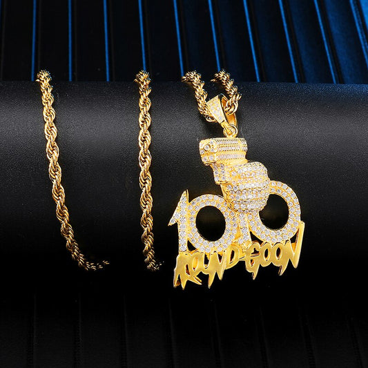 Rhinestone-Studded Gold-Plated "100" Gun Bling Rope Chain Hip-hop Pendant Necklace