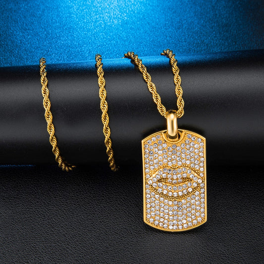 Paved Rhinestone Studded Lips Bling Rope Chain Stainless Steel Hip-hop Pendant Necklace