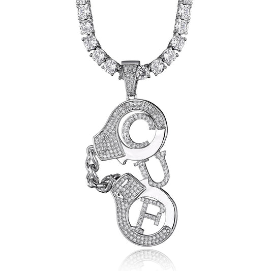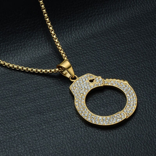 Cubic-Zirconia-Studded Handcuffs Bling Hip-hop Pendant Necklace