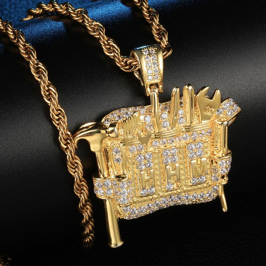 Cubic-Zirconia-Studded Gold-Plated Mechanic Tools Bling Hip-hop Pendant Necklace
