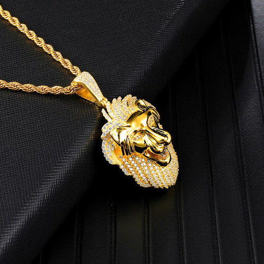 Rhinestone-Studded Gold-Plated Lion Head Bling Stainless Steel Hip-hop Pendant Necklace