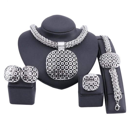 Gold/Silver-Plated Square Pendant Necklace, Bracelet, Earrings & Ring Wedding Jewelry Set