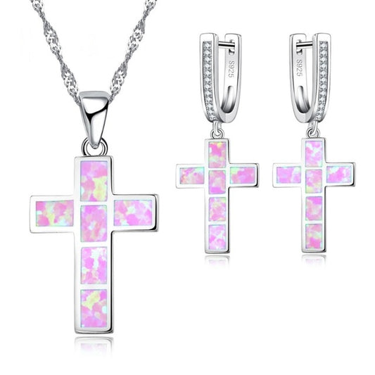 Classic Cross Fire Opal Necklace & Earrings Jewelry Set