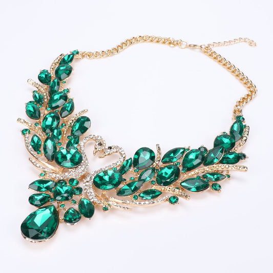 Double Swan Gold-Plated Green Crystal Necklace & Earrings Wedding Statement Jewelry Set