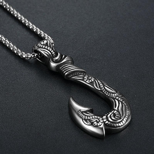Tribal Engraved Silver Fish Hook Pendant Chain Necklace