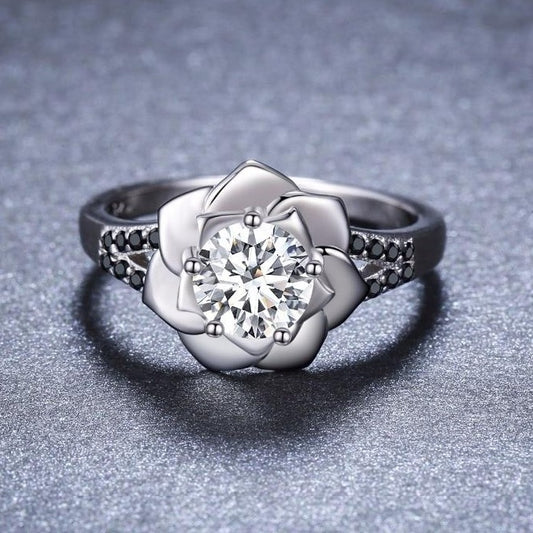 Cubic Zirconia Flower and Black Spinel Stones 925 Sterling Silver Fine Engagement Ring