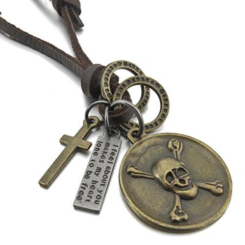 Men's Alloy Genuine Leather Pendant Necklace Silver Gold Tone Brown Cross Pirate Skull Round Cord Ring Adjustable 16~26 Inch Chain