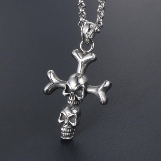 Silver Titanium Double Skull Bone Cross Pendant Necklace