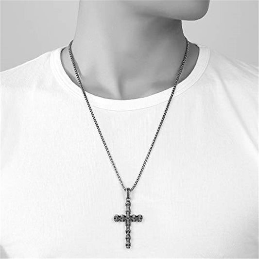 Dark Silver Cross of Skulls Pendant and Chain Necklace
