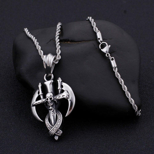 Steel Skull and Scythe Cross Pendant with Chain Necklace
