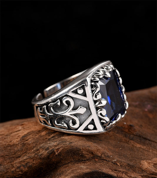 Blue Cubic Zirconia Stone 925 Sterling Silver Adjustable Vintage Heavy Rock Biker Ring
