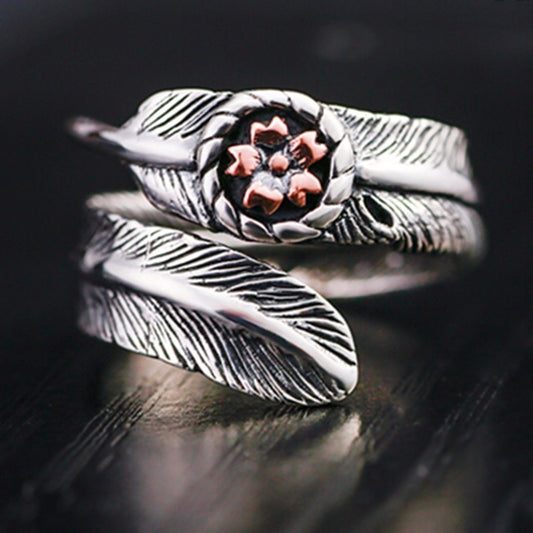 Rose Gold Flower and Feather 925 Sterling Silver Adjustable Vintage Punk Ring