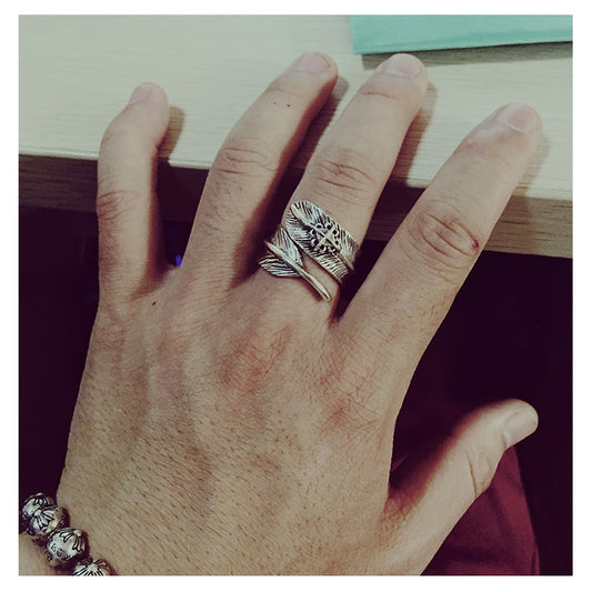 Feather and Cross 925 Sterling Silver Adjustable Vintage Punk Biker Ring