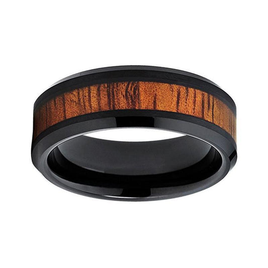Natural Koa Wood Inlay Black Ceramic Ring