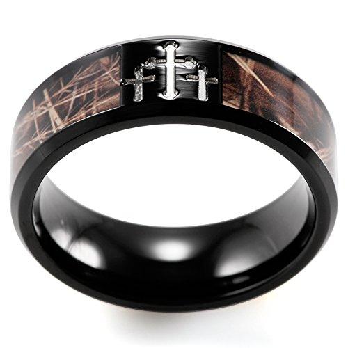 Men's 8mm Black Titanium Ring with Contrasting Engraved Crosses and Brown Camouflage Inlaid