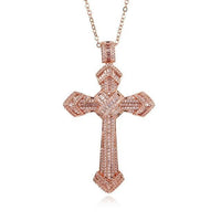 This stunning piece, crafted from real 925 sterling silver is covered in a patterned array of glamorous crystals. Every inch of this piece is covered in a shiny stone. The crystals form a diagonal cross pattern at the center but are lined up in a straight vertical line on the cross legs. At the ends, the pendant forms an arrowhead like shape where the crystals also come together to form multiple V-shaped shining lines. This Innovato Design pendant is available in either a silver, black, rose gold, or gold finish. It also comes with an 18" chain link necklace to match.