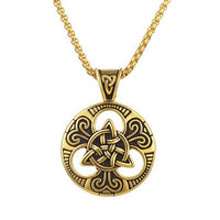 The inner pendant displays a triquetra symbol that features a symmetrical triangular ornament with three interlaced arcs along the edges. The outer section displays a vintage design that is meticulously crafted to perfection. The stainless-steel chain completes the vintage look and comes in gold and silver colors.