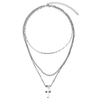Available in both shiny silver and bright gold variants, this 3-layer chain necklace is made up of different chain types. The inner chain is a fine-link choker that spans a length of 14.4", while the 2nd chain is a ball necklace that is slightly longer, extending up to 18.3. The outermost chain is an alternating chain and plate necklace that carries a simple steel cross at the end. All the chains are made from the same durable zinc alloy material and are joined at both ends to form the necklace clasp. An extended 4" chain is found a lock end of the necklace, allowing wearers to adjust the length of this statement piece from Innovato Design to their liking.