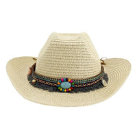 Protect yourself from wind, weather or rain in our Innovato Design Cattleman Cowboy Hat. This outdoor essential was inspired by Native American craft and pattern work. Our Cattleman hat is finely woven from straw and intricately decorated with beads and charms over a multicolored band of red, blue, brown and yellow hues with grey fringes. It's great for festivals, parties or long walks on the great desert plains.
