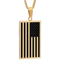 This flat metallic pendant carries the US flag on its cover. The entire flag spans the whole front of the pendant. This piece is made from a 316L stainless steel metal that is available in either a silver-plated or gold-plated variant. Both finishes also offer a choice between the colored flag pattern design or a mono American flag. This Innovato Design pendant is 22 mm x 51 mm in size and comes with a chain link necklace that is 20 inches long.
