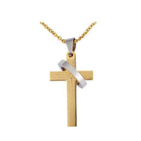 Inscribed in classic Spanish, the Lord's Prayer is written all over this cross pendant. It is only the center of the cross, where a small black cross is embedded, that the words are carefully spaced apart. Surrounding the pendant is a solid silver ring that diagonal encircles the cross. The ring an cross aer made from the same stainless steel silver. However, the ring is only available in the polished silver finish while the cross is available in either gold, silver, black, or blue options. This unique pendant from Innovato Design comes with a long link chain necklace.