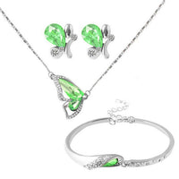 You can spread your wings like a butterfly knowing that you are wearing this beautiful Jewelry Set by Innovato Design. The butterfly ornament in these pieces of jewelry is perfect for showing your glamorous side. Made of 316L stainless steel, this amazing jewelry set has a polished, smooth, and sleek surface over its link chain, pendant, earring backs, and charms. The necklace has a fine link chain and a pendant that is in the form of a butterfly whose wings are covered with crystal channel-set white round brilliant cut stones and crystal bezel-set, "pick your color," pear cut stones. Also, the earring charms have the same design as the necklace pendant while the bracelet has the same gemstones being the charms.