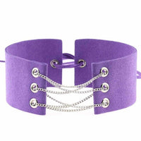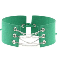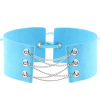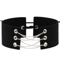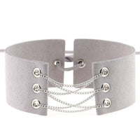 The necklace showcases a unique collar design, accentuated by a gleaming silver chain link that gracefully intertwines with the two supple velvet leather straps. The pièce de résistance is a tasteful lace closure at the back, seamlessly uniting the straps for an alluring finish.