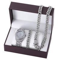 Men Hip-Hop Paved Rhinestones Watch, Bracelet, and Cuban Chain Necklace and Bling Jewelry Set