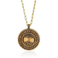 The Yggdrasil is a mythological tree, also referred to as the "Tree of Life". In Norse mythology, it plays a central role in connecting the nine worlds. Surrounding the beautifully engraved Tree are Viking Rune symbols. The runic alphabet is the writing system used before the Latin alphabet was put to use in old Germanic nations. These symbols carry different meanings, most of which relate to the concepts of life, wisdom, strength, and enlightenment. The entire piece retains a rustic antique finish, which is available in both a brass-like gold and matted silver. A chain-link necklace carries and finished off the design of this lovely product from Innovato Design.