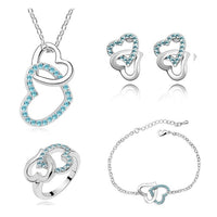 Rhinestone Double Heart Necklace, Bracelet, Earrings & Ring Fashion Jewelry Set