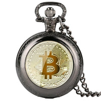 Featuring the most popular cryptocurrency in the world, this pocket watch features a central acrylic case that carries the well-known bitcoin logo. This is one of the most popular bitcoin themed products in Innovato Design. Surrounding the logo are digital terminology relating to the cryptocurrency, as well as an array of lines resembling data lines. The stainless steel case, however, also has other intricate carvings to adorn the borders. The back features a complex pattern of dots resembling that of a lotus flower. The detailed exterior of the pocket watch is matched with a simpler interior watch face - a plain white face with Arabic numerals.