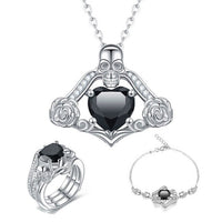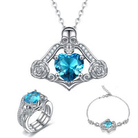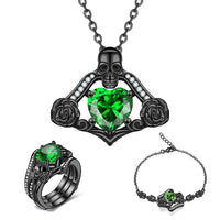 Look amazingly cool with this Wedding Jewelry Set by Innovato Design. The combination of skull, flower, and gemstones in these pieces of jewelry creates a hip punk style that you will love. Made of 316L stainless steel, this amazing wedding jewelry set has a polished, smooth, and sleek surface over its link chain, pendant, charms, shank, and ornaments. The necklace has a cable link chain and a pendant that has a skull, flowers, and a crystal pronged, "pick your color," heart cut main stone. Also, the bracelet charm and the ring ornament have the same design as the necklace pendant. Moreover, the ring is a standard fit type of ring.