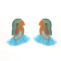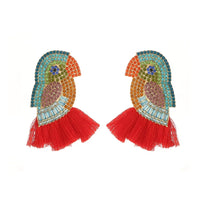 Crafted with meticulous attention to detail, these earrings feature vibrant Austrian crystals meticulously arranged to depict charming parrot motifs. The intricate design is further enhanced by delicate tassel dangles, adding a touch of movement and playfulness to your look. Whether you're dressing up for a special occasion or adding a pop of personality to your everyday ensemble, these earrings are sure to make a statement and spark conversation wherever you go. Embrace your unique style and let your personality soar with these exquisite earrings that effortlessly blend sophistication with a hint of tropical allure.