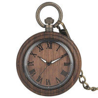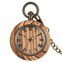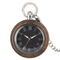 Large roman numerals made of stainless steel embedded seamlessly into the clock face of this wooden pocket watch, make it extremely easy to tell the time. At the outermost border of the watch face, a black border marked with clear white dashes even further mark the minutes and seconds of each hour.