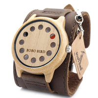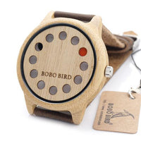 Fashion lovers rejoice! Bobo Bird brings you this Rustic Wooden Watch with Genuine Leather Strap which is perfect combination of creativity and simplicity. This wooden grain watch is made from natural Bamboo and is wrapped by hand. This creates a rustic timepiece that makes a fashionable wear. The watch features Japanese Miyota Quartz movement with a 12 digit display. The red digits represent minutes while the black digits represent the hours. The watch is available in three different shades that are obtained using natural processes. No chemicals or paints are used in the manufacturing of this watch.
